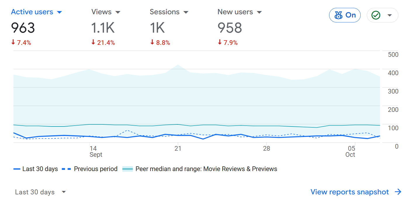 GoodMovieFinder.com averages 1.1k pageviews a month. The owner has not had time to dedicate to the site and has run on autopilot for roughly 6 months.